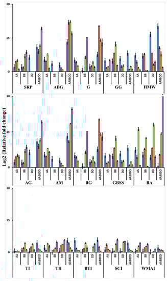 Stage-specific expression (blue—2WAA; red—3WAA; green—4WAA; purple—5WAA) of highly expressed genes belonging to three major classes (NR, CM, and DP) (SRP—sulphur rich seed storage protein; ABG—alpha/beta gliadin; G—germin; GG—gamma gliadin; HMW—high molecular weight glutenin; AG—alpha- glucosidase; AM—alpha-amylase; BG—beta-glucosidase; GBSS—granule bound starch synthase; BA—beta-amylase; TI—trypsin inhibitor CMe; TH—thionin; BTI—Bowman-Birk trypsin inhibitor; SCI—subtilisin chymotrypsin inhibitor; WMAI—wheat monomeric amylase inhibitor)