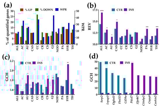 Alterations of the expression level, expression variability, and gene commanding height for all 18,891 quantified unigenes (ALL) and selected functional pathways and individual genes. (a) Percentages of significantly up/down-regulated genes and the Weighted Pathway Regulation (WPR) score of the selected pathways in astrocyte co-cultured with Oli neu cells (INS) with respect to astrocytes cultured alone (CTR). (b) Median Relative Expression Variability (REV) of selected gene groups in each condition. (c) Median Gene Commanding Height (GCH) of selected gene groups in each condition. (d) Top 5 genes (highest GCH scores) in each condition and their GCHs in the other condition. Statistical significance: * p < 0.05, ** p < 0.01, *** p < 0.005, **** p < 0.0001.