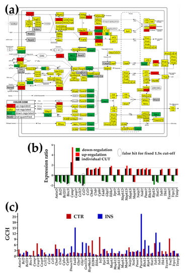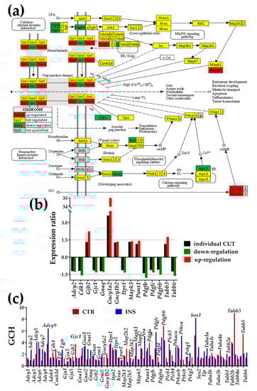 Presence of non-touching Oli-neu cells affects genes in the gap junction (GJ) pathway (modified from https://www.genome.jp/kegg-bin/show_pathway?mmu04540). (a) Regulation (up-red background, down-green background) of the interconnected genes within the GJ pathway. (b) Expression ratios and individual fold-change cut-offs (both negative for down-regulation) of the significantly regulated genes. (c) Gene Commanding Height (GCH) scores of the GJ genes in the two conditions. The most prominent gene in CTR astrocytes is Tubb3 (GCH = 9.07), while in INS cells it is Sos1 (GCH = 8.23). As illustrated in Figure 1c, considering the entire pathway, the median GCH increased by over 17% in INS with respect to CTR.