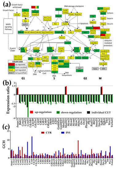 Significantly down-regulated genes include cell division cycles (Cdc20, Cdc25A, Cdc6), cyclins (Ccna2, Ccnb2, Ccnd1), cyclin-dependent kinases (Cdk2, Cdk6), cyclin-dependent kinase inhibitor 2A (Cdkn2a), DBF4 homolog (Dbf4), E2F transcription factors (E2f1, E2f2), growth arrest and DNA-damage-inducible 45 (Gadd45a, Gadd45b), mini-chromosome maintenance deficient (Mcm2, Mcm4, Mcm6, Mcm7), transformed mouse 3T3 cell double minute 2 (Mdm2), origin recognition complex subunits (Orc2, Orc6), protein kinase, membrane-associated tyrosine/threonine 1 (Pkmyt1), polo-like kinase 1 (Plk1), RAD21 homolog (Rad21), retinoblastoma-like 1 (Rbl1), SMAD family member 2 (Smad2), structural maintenance of chromosomes 1A (Smc1a), transforming growth factor, beta 3 (Tgfb3), Ttk protein kinase (Ttk), WEE 1 homolog 1 (Wee1) and tyrosine 3-monooxygenase/tryptophan 5-monooxygenase activation protein, and eta polypeptide (Ywhah).