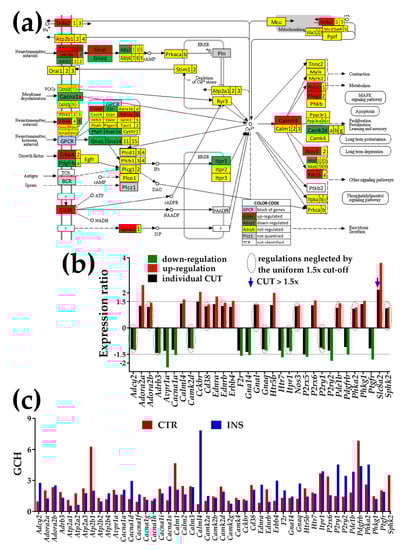 In Figure 4, the significantly up-regulated genes were adenosine A2 receptors (Adora2a, Adora2b), calmodulin-like 4 (Calml4), cholecystokinin B receptor (Cckbr), CD38 antigen (Cd38), endothelin receptors a/b (Ednr/b), erb-b2 receptor tyrosine kinase 4 (Erbb4), 5-hydroxytryptamine (serotonin) receptor 5B (Htr5b), purinergic receptor P2X, ligand-gated ion channel, 6 (P2rx6), phosphodiesterase 1B, Ca2+-calmodulin-dependent (Pde1b), phosphorylase kinases (Phka2, Phkg1), and sphingosine kinase 2 (Sphk2).