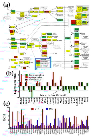 Figure 2 and Figure 3 show the regulation of the KEGG-determined gap junction and cell-cycle pathways, and Figures S1 and S2 in the Supplementary Materials the regulation of the actin-skeleton and circadian rhythm pathways. Graphs below pathways present the expression ratios (together with the respective individual gene fold-change cut-offs, both negative for down-regulation) of significantly altered genes. Each figure also shows the GCH scores of the pathway genes in the two conditions.