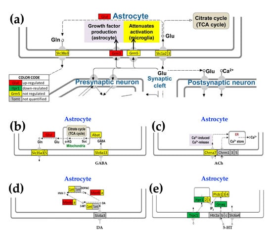 Kyoto Encyclopedia for Genes and Genomes [41,42] was used to select the genes responsible for calcium (map mmu04020), PI3K-Akt (mmu04151), chemokine (mmu040602), thyroid hormone (mmu04919) and NOD-like receptor (mmu04621) signaling pathways. We have also studied the remodeling of the actin cytoskeleton (mmu04810), autophagy (mmu04140), cell-cycle (mmu04110), circadian rhythm (mmu4710), and gap junction (mmu04540). Particular attention was given to the regulation of the astrocytic receptors involved in modulating the activity of the glutamatergic (mmu04724), GABAergic (mmu04727), cholinergic (mmu04725), dopaminergic (mmu04728) and serotonergic (mmu04726) interneuron synapses.