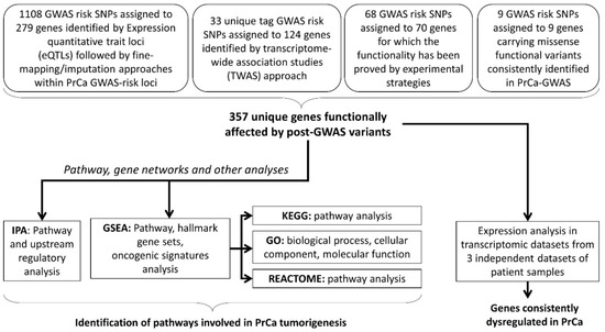 The study design. This flow chart depicts the flow of the analyses that were performed in this study. Assigned genes represent the functional variants that contribute to prostate cancer (PrCa) tumorigenesis via (i) regulating the target genes through the expression quantitative trait loci (eQTLs), (ii) transcriptome-wide association study (TWAS) of the PrCa-risk loci, or (iii) a functional impact evaluated by experiments, or (iv) in-silico studies. Further pathway analysis was performed using different algorithms. In addition, investigating the expression status of the assigned genes demonstrated several overlapped dysregulated genes between three expression datasets and post-GWAS genes. Note: some of the genes have been reported in studies utilising multiple approaches, thus belong to multiple categories that are included in this study. GWAS: genome-wide association studies, IPA: Ingenuity Pathway Analysis, GSEA: Gene Set Enrichment Analysis, KEGG: Kyoto Encyclopedia of Genes and Genomes, GO: Gene Ontology.