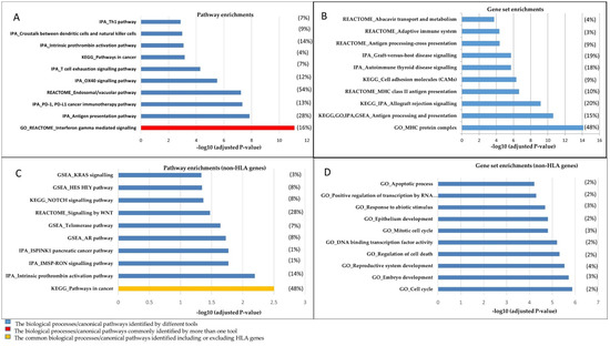 The top 10 significant canonical pathways and gene sets resulting from algorithms used in this study. The diagrams illustrate (A) enrichments in pathways and (B) gene sets in biological processes, including HLA genes. (C,D) represent the analyses conducted while excluding HLA genes. The significant pathways/gene sets have been depicted in the graphs based on –log10 (p-value). A full list of the pathways and gene networks has been represented in Tables S2 and S3. The algorithm that has been used for each pathway/gene set is shown as a prefix. The ratios of post-GWAS/total genes involved in a pathway/gene set are presented in parentheses for a given pathway/gene set. The average of this ratio is presented for a pathway/gene set resulted from more than one tool. Note: To avoid over-presentation of the GO results, we depicted all immune system-related gene sets resulting from GO as antigen processing and the presentation gene set.