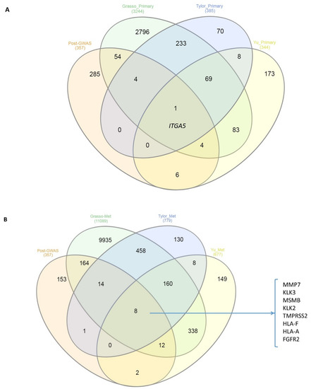 Venn diagram of the overlaps between post-GWAS assigned genes that have been studied here and the three Taylor, Grasso and Yu prostate datasets in (A) primary tumours vs. normal samples and (B) primary tumours vs. metastatic samples. The numbers in parentheses represent the numbers of significant (p-value < 0.05 by more than 1.5 fold change) differentially expressed genes. There is one gene (ITGA5) overlapping in the first comparison, while eight genes listed in (B) are up-or down-expressed commonly in metastatic samples of all three studies and post-GWAS assigned genes.