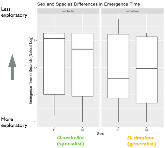 Sex and species differences in emergence time (in seconds): the plot represents species and sex differences in emergence time (in seconds), as noted in the main text. Data are from the first experiment measuring exploratory behavior as a mechanism for environmental sampling. The y-axis represents the natural log of emergence time in seconds. A lower emergence time indicates higher exploratory behavior, while a higher emergence time represents lower exploratory behavior (N = 526 flies). The box in the plot represents the inter-quartile range of scores, including the middle 50% of scores for the group, with the median score represented by the middle quartile mark (or line). The whiskers represent the score ranges outside the inter-quartile range, including the top 25% of scores for the group in the upper whisker, and the bottom 25% of scores in the lower whisker. Our findings indicated significant sex, but not species, differences in exploratory behavior, with males showing significantly shorter emergence time than females.