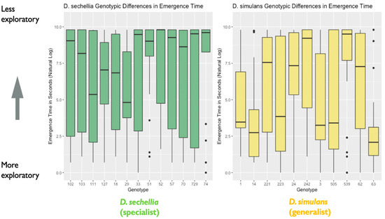 We found support for sex differences in exploratory behavior, represented by the amount of time (in seconds) taken to emerge from a shelter into a novel environment. We found a significant effect of sex on emergence time (X2 = 4.06, degrees of freedom = 1, p = 0.04), with males showing significantly shorter emergence time than females (Figure 2). We found no effect of species on emergence time (X2 = 1.97, degrees of freedom = 1, p = 0.16), nor an effect of a two-way interaction between Species and Sex (X2 = 0.05, degrees of freedom = 1, p = 0.83). However, we did find evidence that genotypes differed significantly in emergence time based on the results of our likelihood ratio test, as including genotype as a random effect significantly improved model fit (likelihood ratio = 18.25, degrees of freedom = 1, p < 0.001). Additional follow-up models investigating the effect of genotype separately for each species indicated that the D. simulans (generalist) genotypes differed significantly in emergence time. A likelihood ratio test indicated that including genotype as a random effect significantly improved model fit for D. simulans (X2 = 19.12, degrees of freedom = 1, p < 0.0001). However, this was not the case for the D. sechellia (specialist) genotypes (X2 = 0.0005, degrees of freedom = 1, p = 0.98) (Figure 3).
