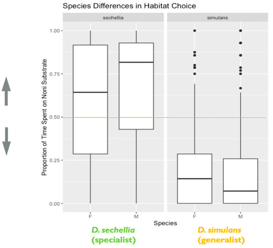 Species and sex differences in habitat choice: the plot represents species and sex differences in habitat (food substrate) choice, as noted in the main text. Data are from the second experiment measuring habitat choice as a representation of decision making. The y-axis represents the proportion of time spent on the imitation noni substrate. Lower values closer to 0 indicate a habitat preference for the plain substrate, while higher values closer to 1 indicate a habitat preference for the imitation noni substrate. A value on or near 0.5 (marked by the orange line) indicates no demonstrable habitat preference for either the plain or imitation noni substrates (N = 526 flies). The box in the plot represents the inter-quartile range of scores, including the middle 50% of scores for the group, with the median score represented by the middle quartile mark (or line). The whiskers represent the score ranges outside the inter-quartile range, including the top 25% of scores for the group in the upper whisker, and the bottom 25% of scores in the lower whisker. The dots beyond the whiskers represent outlier values. Our findings indicated that species differed significantly in habitat choice. Additionally, sex significantly influenced habitat choice, with males showing stronger habitat choice preference than females.