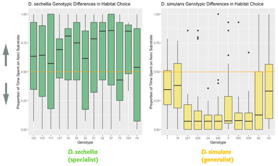 Genotypic differences in habitat choice: the plot represents genotypic differences in habitat (food substrate) choice, as noted in the main text. Data are from the second experiment measuring habitat choice. The y-axis represents the proportion of time spent on the imitation noni substrate. Lower values closer to 0 indicate a habitat preference for the plain substrate, while higher values closer to 1 indicate a habitat preference for the imitation noni substrate. A value on or near 0.5 (marked by the orange line) indicates no demonstrable habitat preference for either the plain or imitation noni substrates (N = 526 flies). The box in the plot represents the inter-quartile range of scores, including the middle 50% of scores for the group, with the median score represented by the middle quartile mark (or line). The whiskers represent the score ranges outside the inter-quartile range, including the top 25% of scores for the group in the upper whisker, and the bottom 25% of scores in the lower whisker. The dots beyond the whiskers represent outlier values. Our findings indicated that genotypes differed significantly in habitat choice.