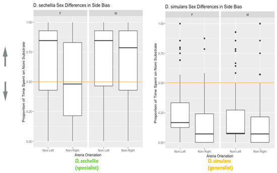Species and sex differences in the effect of side bias on habitat choice: the plot represents species and sex differences in the effect of side bias on habitat choice, as described in the main text. Data are from the second experiment measuring habitat choice as a representation of decision making. The y-axis represents the proportion of time spent on the imitation noni substrate. Lower values closer to 0 indicate a habitat preference for the plain substrate, while higher values closer to 1 indicate a habitat preference for the imitation noni substrate. A value on or near 0.5 (marked by the orange line) indicates no demonstrable habitat preference for either the plain or imitation noni substrates. The x-axis is divided both by sex, as well as the arena orientation i.e., whether imitation noni substrate was on the left or right (N = 526 flies). The box in the plot represents the inter-quartile range of scores, including the middle 50% of scores for the group, with the median score represented by the middle quartile mark (or line). The whiskers represent the score ranges outside the inter-quartile range, including the top 25% of scores for the group in the upper whisker, and the bottom 25% of scores in the lower whisker. The dots beyond the whiskers represent outlier values. Our findings indicated that species and sexes differed significantly in habitat choice. Additionally, a left-side bias significantly influenced habitat choice, with females showing a stronger effect of left-side bias on habitat choice than males.