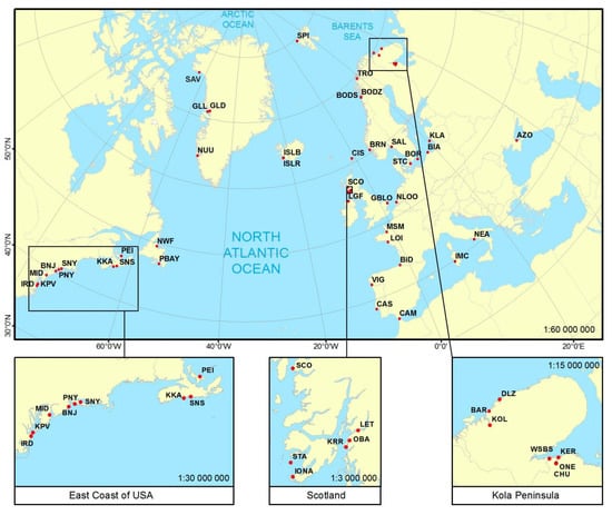 Mytilus spp. samples, consisting of 1204 individuals of mixed ages and size 5–50 mm were collected from 43 localities in North America and Europe, including the arctic and subarctic regions. Eleven samples were obtained from North America (USA, Canada, Greenland); fourteen were obtained from arctic and subarctic regions of Europe (Iceland, Norway, Russia); seven from British Isles and Ireland; four from the Baltic Sea; four from the Atlantic coast of Europe; and three from the Mediterranean and Azov Seas. Forty-three samples consisted of 17 to 40 (mainly about 30) individuals, while two samples from Spitsbergen and Mont Saint-Michel consisted of 4 individuals (Table 1, Figure 1). DNA was isolated from the mantle tissue, stored in 96% ethanol or at −70 °C, using a modified CTAB method according to Hoarau et al. [60]. The individuals of M. trossulus from North-west Greenland, Savissivik (SAV), identified in Bach et al. [26] were used as reference samples of M. trossulus. Two populations, Indian River, Delaware (IRD) from the Atlantic coast of North America and Loire (LOI) from the Atlantic coast of North Europe, provided reference samples of M. edulis [25]. Populations from the Atlantic coast of South Europe at Bidasoa, Spain (BID) and from the Azov Sea (AZO) were reference samples of M. galloprovincialis [17,25]. A few samples used in our earlier works (ISLR in [17], ISLB and AZO in [61], BAR, ONE, LET and VIG in [21]) were genotyped with a set of single nucleotide polymorphisms (SNPs) for the purposes of this study. Except for these seven samples, results of genotyping with the same set of SNPs [25,26,37,38,62] were included in this study as shown in Table 1.