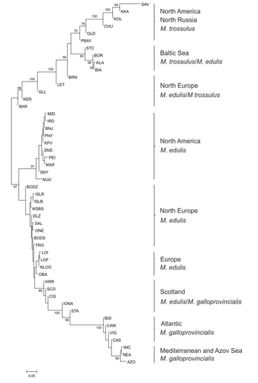 European M. trossulus are not genetically homogenous, but are subdivided into two clusters, Baltic populations and all other settlements. Distinctness of the Baltic mussel is primarily explained by its mixed nature due to the strong introgression of M. edulis genes (see [23,45] for more discussion). Other European M. trossulus populations are indistinguishable from the Canadian ones. The structure of mitochondrial DNA variation in these natural populations (e.g., LET), indicates either relatively long (thousands rather than hundreds of years) vicariance [22] or a long history of introgressive hybridization with M. edulis (Baltic mussel [12,24,97]). Singular or multiple natural invasions from continental populations of West Atlantic, most probably Holocene, better explain existence of M. trossulus populations in Scotland, Western Norway and the Baltic Sea.
