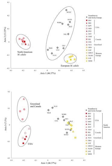 The level of polymorphic SNPs (Po) ranged from 37.04% to 88.9% among populations (Table 1). The lowest values were observed in American and European M. edulis populations, particularly in the population from Nuuk (Greenland NUU) and from the Atlantic coast of Europe (NLOO). The highest levels of polymorphism were found in Norway (Bergen BRN) and in the Baltic Sea (STC). There are also high levels of polymorphism in the Arctic and Subarctic populations (e.g., KOL, KER, GLD), where hybridization between M. edulis and M. trossulus also occurs, with 77–85% of the SNPs being polymorphic (Table 1). Among populations from the Hebrides Scotland, where there is an M. galloprovincialis introgression, about half of the SNPs were polymorphic (e.g., IONA, STA).