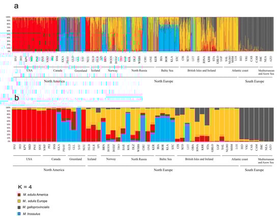 Correspondence analysis was carried out to characterize M. edulis population structure. Analysis was performed for 54 SNP and 25 samples of M. edulis from North America, Scandinavia, Arctic and Western Europe (Figure 3). The first 2 axes accounted for 60% of the total variation, while axis 3 accounted for 7% of the variation. Axis 1 showed a clear separation between American and European populations of M. edulis. The American and Western Europe populations each form a very tightly clustered group while the Scandinavian and Arctic cluster, situated between them, had much greater dispersion. Along axis 3 there was a separation between populations from USA and those from Canada and Greenland. Structure analysis after applying the ΔK method [73] carried out for 54 SNPs and 53 samples, showed that the highest ΔK was found for K = 2, when differentiation was found between M. trossulus and other Mytilus taxa, then for K = 3, when M. edulis and M. galloprovincialis clustered separately. The LnP(K) value suggests further subdivision into four clusters with M. edulis splitting into two distinct groups: American and European populations (Figure 4a,b). This pattern of subdivision confirmed the results obtained using the NJ tree and the CA analysis. Scandinavian and Arctic populations with M. edulis genome and three individuals from Spitsbergen were potentially admixed of American and European M. edulis.