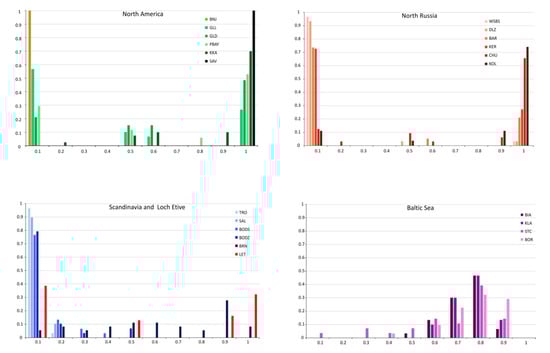Frequency distribution of the score for a hybrid index giving the percentage of M. trossulus characteristic alleles. A score of zero is a pure M. edulis, whereas a score of one is a pure M. trossulus. Analysis was presented for four groups of populations: North America, North Russia, Scandinavia with Scotland and Baltic Sea. See Table 1 for definition and abbreviations.