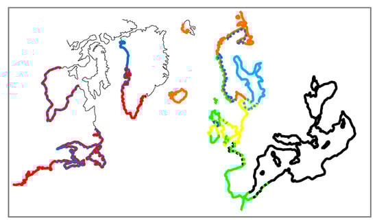 In this study we investigated spatial genetic variability in populations of the Mytilus species complex in the North Atlantic and adjacent Arctic waters at different geographical scales. Most of our results on taxonomic affinities of geographical populations are consistent with the earlier findings and complement the previous studies well. This allows us to provide a general picture on spatial distribution of mussel species (Figure 6) and intraspecific lineages and to discuss their evolutionary history. No such attempts have been undertaken since the introduction of SNP-based methods in blue mussel genetics in the early 2010 s (e.g., [21,44]).