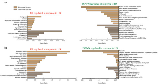 Heat stress resulted in 552 and 879 genes being significantly (FDR < 0.1) differentially expressed in male and female groups respectively. Out of those, 236 and 540 genes were up-regulated and 316 and 339 genes were down-regulated in female and male pigs respectively (Figure 1b,d, File S3). The genes modulated in response to heat stress were considerably different between the male and female groups, with only 19 up-regulated and 11 down-regulated genes being common between the groups (Figure 1e,f). Among the top up-regulated DEGs in the female group were HIST2H2AA4 (histone cluster 2H2A family member a4), MYH4 (myosin heavy chain 4), ABCA6 (ATP binding cassette subfamily A member 6), HSF4 (heat shock factor 4) and IL18 (interleukin 18), while top down-regulated DEGs included CXCL10 (C-X-C motif chemokine 10), IDO1 (indoleamine 2,3-dioxygenase 1), HES4 (Hes family BHLH transcription factor 4) and IFI6 (γ-interferon-inducible protein Ifi-16); in the male group the up-regulated genes included DES (Desmin), RAG1 (recombination activating 1), LSAMP (limbic system associated membrane protein), CD1E (CD1e molecule), HSPG2 (heparin sulfate proteoglycan 2) and down-regulated genes included CEBPE(CCAAT/enhancer binding protein), ZNF316 (Zinc Finger Protein 316), PXDC1(PX domain containing 1) and COX4I1 (cytochrome c oxidase subunit 4l 1).