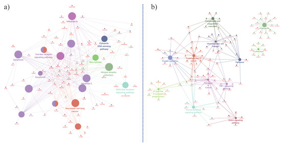 KEGG pathway enrichment analysis: (a) enriched KEGG pathways in female group; (b) enriched KEGG pathways in male group. Nodes are genes and edges represent pathways. Up-regulated genes are represented as rectangles and down-regulated genes are represented as hexagons.