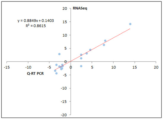 qRT-PCR validation of RNA-Seq results, using the top 10 DEGs from male and female groups respectively. The fold change from q-RT PCR was plotted on the x-axis, and the log2 fold change from the RNA-Seq analysis was plotted on the y-axis; and the correlation between the two methods is given in the figure.