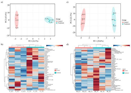 Metabolome analysis: (a) metabolic profiles of the female group visualized with principal component analysis; (b) heat map of all metabolites identified in the female group; (c) metabolic profiles of the male group visualized with principal component analysis; (d) heat map of all metabolites identified in the male group.