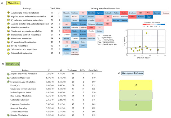 Metabolic pathways altered in the female group: (a) Metabolic pathway enrichment analyses of metabolites enriched in response to heat stress. (b) Metabolic pathway enrichment analyses of genes differentially expressed in response to heat stress. (c) Number of overlapping pathways enriched with DEGs and significantly differing metabolites in the heat stress group.