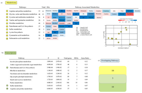 Among the male animals, 10 metabolic pathways were enriched with differently enriched metabolites, including “arginine and proline metabolism,” “glycine, serine and threonine metabolism,” “cysteine and methionine metabolism,” “taurine and hypotaurine metabolism” and “histidine metabolism” (Figure 7a). The metabolic pathways enriched with DEGs (Figure 7b) included “inositol phosphate metabolism,” “amino sugar and nucleotide sugar metabolism,” “pantothenate and COA biosynthesis” and “riboflavin metabolism.” Comparative analysis of the metabolic pathways enriched with DEMs and DEGs showed that three metabolic pathways were common (Figure 7c); those were “pantothenate and CoA biosynthesis,” “sulfur metabolism” and “arginine proline metabolism.” Pantothenate and CoA biosynthesis was previously found to be enriched in response to HS in the pig [5,20].