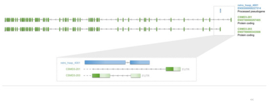 - Shimizu, A.; Asakawa, S.; Sasaki, T.; Yamazaki, S.; Yamagata, H.; Kudoh, J.; Minoshima, S.; Kondo, I.; Shimizu, N. A novel giant gene CSMD3 encoding a protein with CUB and sushi multiple domains: A candidate gene for benign adult familial myoclonic epilepsy on human chromosome 8q23.3-q24.1. Biochem. Biophys. Res. Commun. 2003, 309, 143–154. [Google Scholar] [CrossRef]
