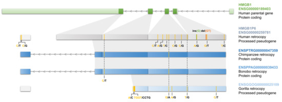 - Vinckenbosch, N.; Dupanloup, I.; Kaessmann, H. Evolutionary fate of retroposed gene copies in the human genome. Proc. Natl. Acad. Sci. USA 2006, 103, 3220–3225. [Google Scholar] [CrossRef]