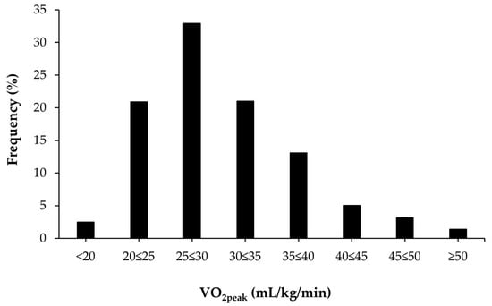Distribution of peak oxygen uptake (VO2peak) data in the study participants.