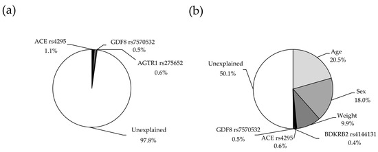 Variance in peak oxygen uptake in the study participants explained by genetic variants alone (a) and by genetic variants plus anthropometric covariates (b). Abbreviations for gene names: ACE, angiotensin-converting enzyme; AGTR1, angiotensin II receptor type 1; BDKRB2, bradykinin receptor B2; GDF8, growth differentiation factor 8 (also known as ‘myostatin’).