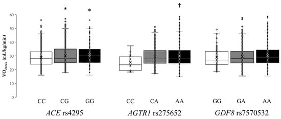 Box-and-whisker plots showing peak oxygen uptake (VO2peak) in the study participants according to genetic variations in the genes for angiotensin-converting enzyme (ACE; rs4295), angiotensin II receptor type 1 (AGTR1; rs275652), and growth differentiation factor 8 (GDF8, also known as ‘myostatin’; rs7570532). The lines in the box represent the first, second (median) and third quartiles, and the whiskers represent 1.5 × interquartile ranges. Each dot represents one individual within the specified genotype. (*) Depicts a statistically significant difference from CC genotype in ACE rs4295 polymorphism at p < 0.05. (†) Depicts a statistically significant difference from CC genotype in AGTR1 rs275652 polymorphism at p < 0.05.