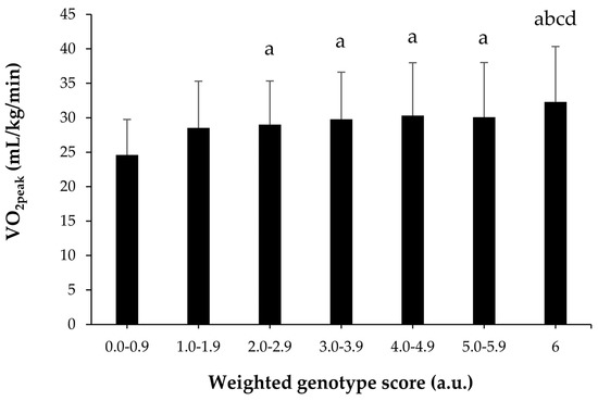 Peak oxygen uptake (VO2peak) levels in the study participants according to the genotype score (computed by using a weighted score of angiotensin-converting enzyme rs4295, angiotensin II receptor type 1 rs275652 and growth differentiation factor 8 rs7570532 genotypes). Abbreviations/symbols: a.u., arbitrary units; a, difference from 0–0.9 a.u. at p<0.05; b, difference from 1.0–1.9 a.u. at p < 0.05; c, difference from 2.0–2.9 a.u. at p < 0.05; d, difference from 3.0–3.9 a.u. at p < 0.05.