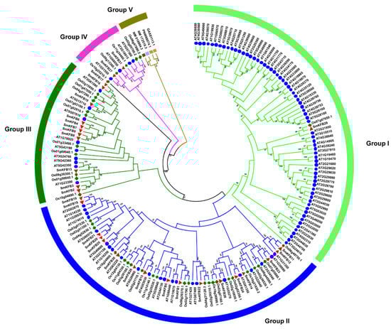 To get a detailed knowledge of the evolutionary relationship and topological structure of the S. miltiorrhiza KFB protein family, a neighbor-joining (NJ) phylogenetic tree was constructed from 31 S. miltiorrhiza KFB proteins, 103 A. thaliana KFB proteins, 46 O. sativa KFB proteins, two Chlamydomonas reinhardtii KFB proteins, one Homo sapiens KFB protein, and one Mus musculus KFB protein. All plant KFB protein clades were separated from animal KFB clades (Figure 1). Due to the absence of KFB protein in Charophyceaes, a small group of predominantly freshwater green algae represents the most recent common ancestor of land plants []; we rooted the tree with human KFB, M. musculus KFB, and two C. reinhardtii KFB proteins. According to the well-supported bootstrap data, the phylogenetic tree divided the KFBs into five clades, named from Groups I to V.