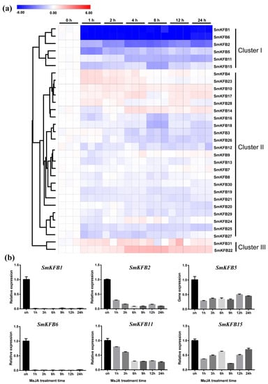 As shown in Figure 3a, all of the 31 SmKFBs having expression profiles were roughly clustered into three groups based on their expression pattern. Of the three groups, the genes in Cluster I were mainly downregulated after MeJA treatment. For example, SmKFB1, SmKFB2, and SmKFB6 were markedly downregulated by MeJA treatment with a similar expression pattern (Figure 3b). The gene expression of SmKFB5 decreased by about 2 times with the MeJA treatment. In addition, the gene expression pattern of SmKFB11 was slowly downregulated along with the sample points. However, the transcript level of SmKFB15 was slowly upregulated within 3 h after treatment.