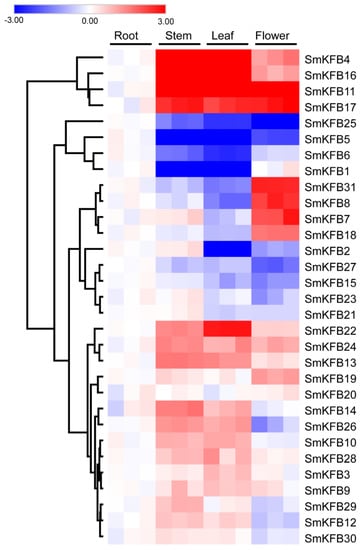 Tanshinones and phenolic acids are mainly distributed in the root of S. miltiorrhiza. However, tanshinones were not detected in the aerial parts of S. miltiorrhiza []. There was an uneven distribution of tanshinones and phenolic acids in S. miltiorrhiza tissue, indicating those secondary metabolism related genes have tissue-specific gene expression. Therefore, in this study, we examined 31 SmKFBs gene profiles from different tissues of this plant. As shown in Figure 4, all of the 31 SmKFBs genes were expressed in all analyzed tissue but with a differential expression pattern.