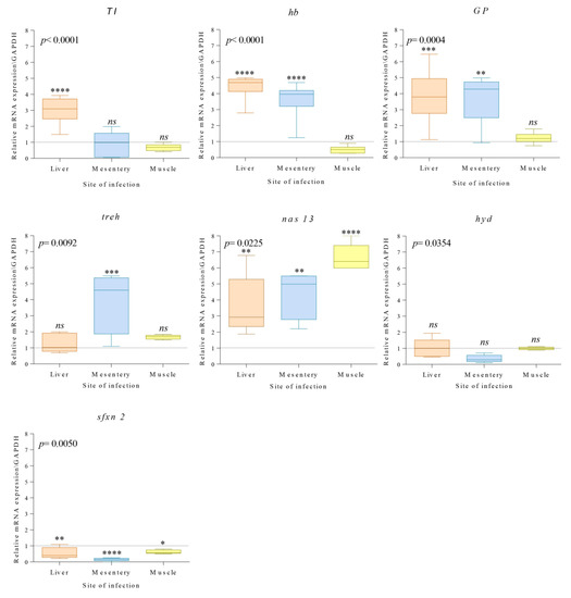 Box-plot representation of relative expression profiles of 7 genes coding for proteins, i.e., TI, hb, GP, treh, nas 13, hyd, sfxn 2, normalized to the geometric mean of gpd in Anisakis simplex (s.s.) larvae infecting different host-fish tissues (liver, mesentery, muscle). The control, represented by larvae recovered in the stomach lumen of the fish host, is given as normalized to a value of 1 (dashed line). Each box shows the minimum, first quartile, median, third quartile, and maximum gene expression values of three biological replicates. Asterisks indicate the significance level of the differences between each group of A. simplex (s.s.) larvae from different sites of infection and the control group. Significance was fixed at p < 0.05 (* p < 0.05, ** p < 0.01, *** p < 0.001, **** p < 0.0001); ns = not significant. One-way ANOVA analysis on the relative gene expression is shown in the top left of each box.