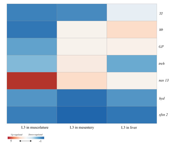 Heat map presenting the changes in the gene expression of Anisakis simplex (s.s.) larvae collected from different fish tissues. Gene expression was first calculated relative to the geometric mean of gpd and then was standardized following a standard score normalization against the corresponding control (larvae recovered in the internal lumen of the stomach) samples. Shades of red and blue, respectively, indicate the highest and lowest expression levels, as specified in the scale bar at the bottom of the figure. This heatmap was produced with the ClustVis web tool [83].