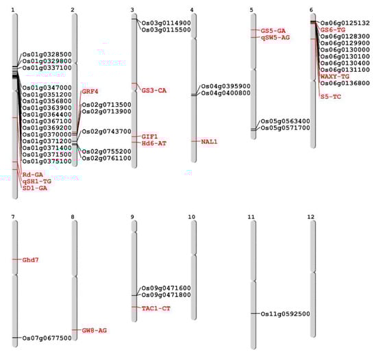 Genomic location of 54 polymorphic SNP markers used in this study. The markers represented by black and red indicate those newly developed on common japonica regions and those previously developed for agronomic trait related genes, respectively.