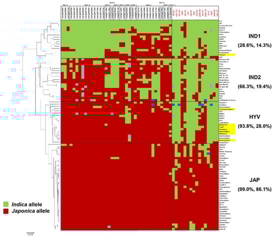 The results of genotyping showed a dividing pattern for 94 varieties. A phylogenetic analysis of 94 varieties was carried out using 54 polymorphic SNP markers. There were four groups, including IND1, IND2, HYV, and JAP, in the phylogenetic tree (Figure 3). All the sequenced HYVs, except Takanari, which possesses indica allele of Chr1-1 and Chr1-2, were clustered in the HYV-group with seven Tongil-type and five indica varieties. These varieties were developed by inter-subspecific crosses or by inter-varietal crosses including the parents of Tongil-type varieties. For example, Keunseombyeo was derived from a cross between Dasanbyeo and Namyeongbyeo []. Taebaekbyeo was used for the development of Hanareumbyeo and Dasanbyeo (Figure S1, F–G). On the other hand, among the five indica varieties, four indica (IR24, IRBB23, IRBB61, and IRBB66) were developed by the International Rice Research Institute (IRRI). IRBB23, IRBB61, and IRBB66 are near-isogenic line series of IR24 for the improvement of the resistance against bacterial leaf blight []. IR24 is a good eating quality and high-yielding variety developed from the inter-subspecific crosses using one tropical japonica (CP-SLO) and two indica (SIGADIS and IR8) []. Furthermore, IR24 was included in the breeding program of six HYVs, which were used for resequencing in this study. (Figure S1, C–H). This implies that the specific genomic regions were conserved in the HYV group by the selections during the conventional breeding programs for HYV development.