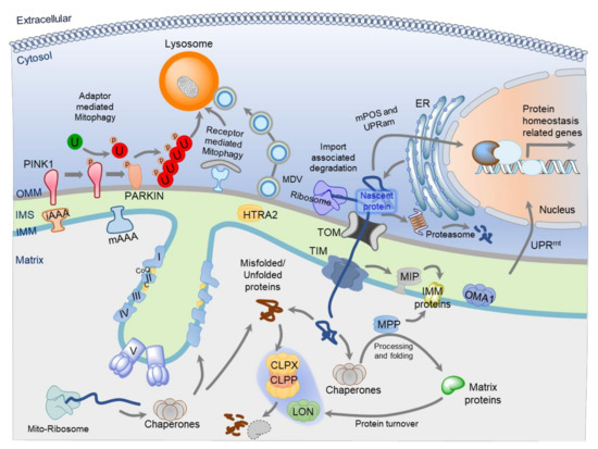 Previous evidence supports that mitochondria evolved from the engulfment of an α-proteobacterium by a pre-eukaryotic progenitor cell and comprised of the outer (OMM) and inner mitochondrial membranes (IMM) which invaginate to form the cristae [6]. These phospholipid bilayer membranes separate the intermembrane space (IMS) from the matrix [1,6,7,8]. The mitochondrial membranes have distinct lipid composition, which makes them different from any other membrane present in eukaryotic cells [1,6,7,8]. The phosphatidylglycerol and cardiolipin are exclusively present in the mitochondrial membranes [1,6,7,8]. The protein density in the mitochondrial membranes is higher than other biological membranes; the protein to lipid ratio of OMM is ~50:50, IMM is ~80:20, whereas in the plasma membrane is ~20:80 [9,10,11,12]. Besides that, mitochondrial matrix protein density is around ten-fold higher than the cytosolic protein density [9,10,11,12]. Most of the mitochondrial enzymatic reactions are tightly coupled; therefore, a compact arrangement of the mitochondrial proteome allows its functions to run smoothly. Mitochondria also contain a small circular genome, mitochondrial DNA (mtDNA) that is structured into distinct nucleoids in the matrix and also have their own RNA and protein synthesis machinery [1,7,8]. Studies suggest that mtDNA includes only 37 genes, and most of the mitochondrial genes (~1500) are present at the nuclear DNA (nDNA) [8]. The mtDNA codes for only 13 proteins; the remaining mitochondrial proteins are encoded by nuclear genes [8,13]. The mtDNA encoded proteins are hydrophobic membrane subunits of the electron transport chain (ETC). These proteins synthesized at the membrane-anchored mitochondrial ribosomes, which allow the direct integration of nascent proteins into the IMM [14,15]. The nuclear-encoded mitochondrial proteins are produced on cytosolic ribosomes and actively imported into mitochondria via the TOM/TIM complexes (translocase of outer and inner membrane) [15,16]. The proper coordination between mitochondrial and nuclear genomes is essential for mitochondrial function and perturbations can result in proteotoxicity. Therefore, some mechanisms must exist to protect the mitochondrial proteome from proteotoxicity and to remove damaged proteins or even whole mitochondria, to ensure mitochondrial homeostasis. Experimental evidence suggests that dysfunctional mitochondrial protein quality control is an earlier cellular event involved in several human diseases. However, the understanding of these pathways in human physiology and their association with pathologies remains insufficient.