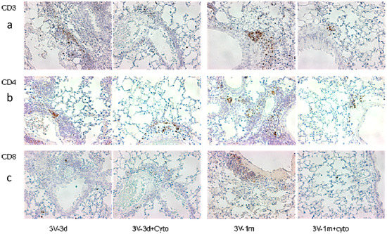 CD3 (a), CD4 (b), and CD8 (c) protein expression in mouse lungs. IHC (immunohistochemical) staining was performed in paraffin sections of mouse lungs and stained with antibodies against CD3, CD4, and CD8. The positive cells are shown in brown color. The sample labelling is the same as in Figure 2.