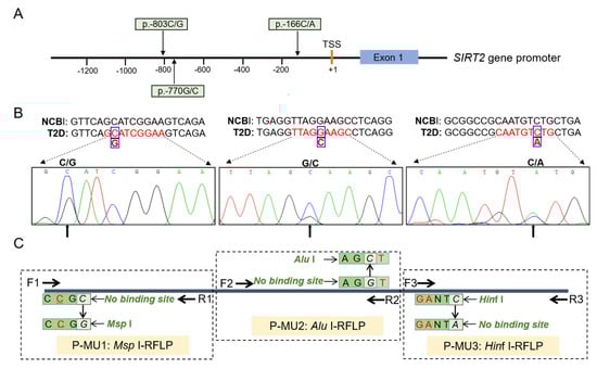 The extracted genomic DNA from all study cohorts was quantified using NanoDrop One (ThermoFisher, Waltham, MA), and the concentration was diluted to 50 ng/μL. A fragment of 1675 bp (from −1782 to −108) within the human SIRT2 gene promoter region was amplified and bi-directionally sequenced using an ABI PRISM BigDye Terminator v3.1 Cycle Sequencing kit and an Applied Biosystems 3730XL genetic analyzer (Applied Biosystems, Foster City, CA, USA). The sequenced PCR products were aligned with the SIRT2 promoter sequences (NCBI, NC_000019.10) using a BLSTN assay. The identified SNP loci were genotyped by the PCR-restriction fragment length polymorphism (PCR-RFLP) method in this study. In detail, the Msp I-RFLP, Alu I-RFLP, and Hinf I-RFLP were established to genotype the P-MU1, P-MU2, and P-MU3 loci of the SIRT2 gene, respectively. The primers that were used for detecting and base remodeling are listed in Table S2. More importantly, the accuracy of the RFLP genotyping assay was evaluated due to the concordance between duplicate samples (up to 100% for each SNP).