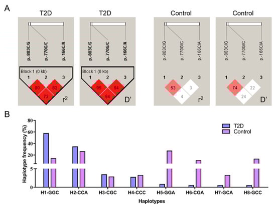 Linkage disequilibrium analysis and haplotype block construction of the SIRT2 variants. (A) Linkage analysis (r2 and D’) of the three SNPs in the T2D and control groups. (B) Haplotype frequencies of the three loci in both T2D and controls.