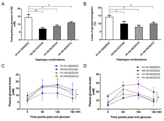 Associations of the SIRT2 haplotype combinations with clinical characteristics in T2D patients. Effect of haplotype combinations on fasting plasma glucose (A) and glycated hemoglobin levels (B). Effect of haplotype combinations on glucose content (C) and insulin level (D) during an OGTT test. Data are given as the mean ± SE. * p < 0.05 or ** p < 0.01 shows a significant difference.