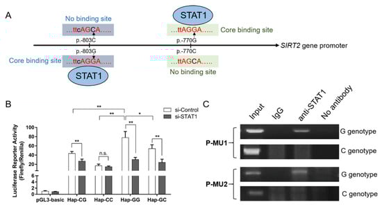 STAT1 can affect the promoter activity by binding to the SIRT2 promoter variants. (A) Putative binding sites of STAT1 were disrupted by the P-MU1 and P-MU2 loci. (B) STAT1 affected the SIRT2 promoter activity by a reporter assay. (C) STAT1 binds to promoter sequences with allele G of the P-MU1 and P-MU2 loci by a ChIP assay. Data were given as the mean ± SE. * p < 0.05 or ** p < 0.01 shows a significant difference; n.s. represents no significance.