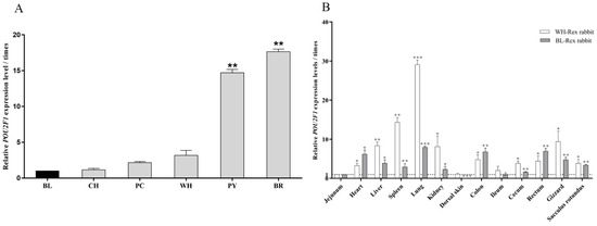 Expression patterns of POU2F1 gene. (A) The expression level of POU2F1 in the dorsal skin of Rex rabbits with different fur colors. BL: black, CH: chinchilla, WH: white, BR: brown, PY: protein yellow, and PC: protein chinchilla. POU2F1 expression levels in the dorsal skin of the black Rex rabbit were used as the control to calculate the relative expression levels in Rex rabbits of other colors in figure A. (B) The expression level of POU2F1 in different organ tissues of the white and black Rex rabbit. POU2F1 expression levels in jejunum of the white and black Rex rabbit were used as controls for calculating the relative expression level in corresponding Rex rabbits in figure B. * p < 0.05, ** p < 0.01, and *** p < 0.001.