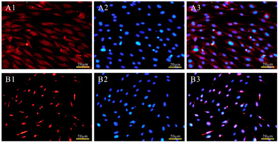 Subcellular localization of POU2F1 protein in rabbit melanocytes. The pcDNA3.1(+)-Myc (A1–A3) and recombinant plasmids pcDNA3.1(+)-Myc-POU2F1 (B1–B3) were transiently transfected into rabbit melanocytes. Cells in groups A and B are melanocytes magnified 40 times by fluorescence inverted microscope. A1 (B1) is the Myc-tag dyed by Cy3, and A2 (B2) is the DAPI-dyed nucleus, which are merged in A3 (B3).