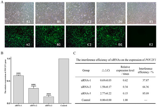 Interference efficiency of siRNAs on POU2F1 expression. (A) Melanocyte morphology 24 h after FAM-siRNAs transfection. (A–E) represent siRNA-1, siRNA-2, siRNA-3, NC, and blank, respectively. (B,C) show interference efficiency of siRNAs on POU2F1 expression. *** p < 0.001.