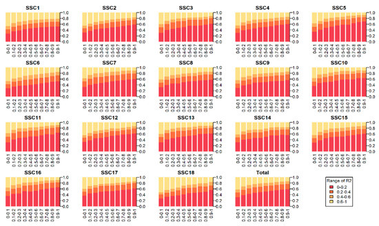 The tendencies of linkage disequilibrium decay across autosomes. The x-axis indicates the diverse classes of distance between SNPs pairs up to 1.0 Mb in each chromosome and the total autosomes, the y-axis indicates the proportion of varied r2 classes.
